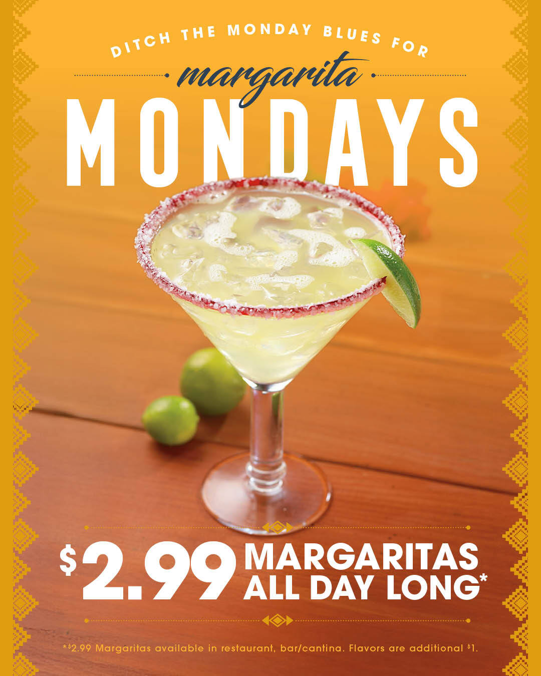 *$2.99 Margaritas available in restaurant, bar/cantina. Flavors are additional $1.